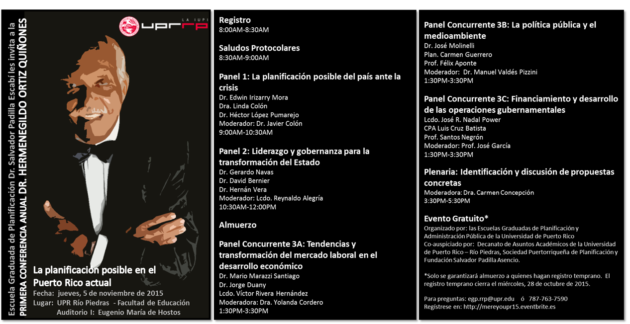 La Escuela Graduada de Planificación Dr. Salvador Padilla Escabí invita a la Primera Conferencia Anual Dr. Hermenegildo Ortiz Quiñones – La planificación posible en el Puerto Rico actual, a celebrarse el jueves, 5 de noviembre de 2015, como parte de las actividades de la Semana de la Planificación.